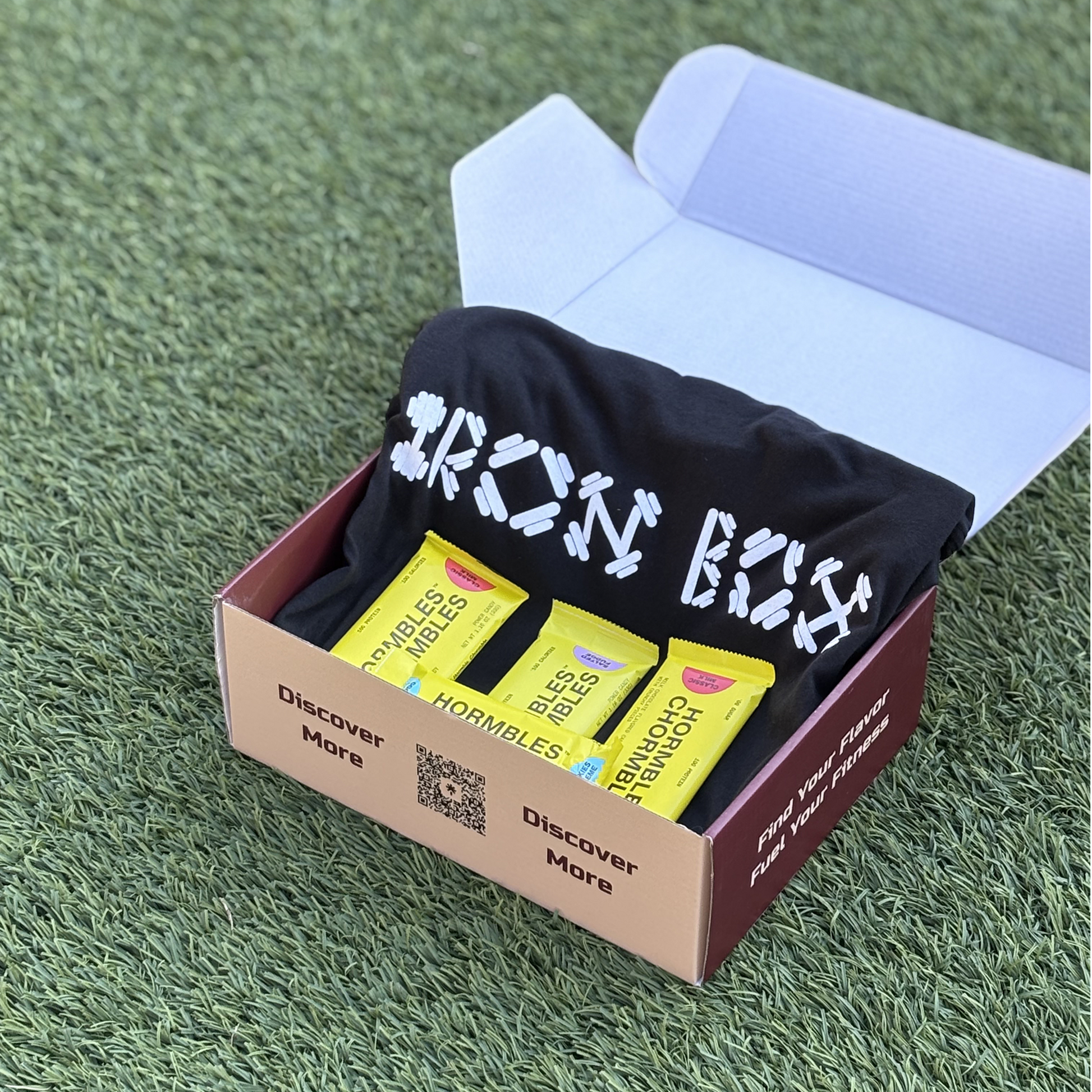 Discover the IronBox V4 (HORMBLES CHORMBLES), an exclusive collaboration featuring four high-protein chocolate bars from HORMBLES: two Classic Milk, one Cookies and Creme, and one Salted Fudge. This sample box also includes a limited edition IronBox T-shirt and a discount code for future purchases, offering both premium nutrition and added value for fitness enthusiasts.